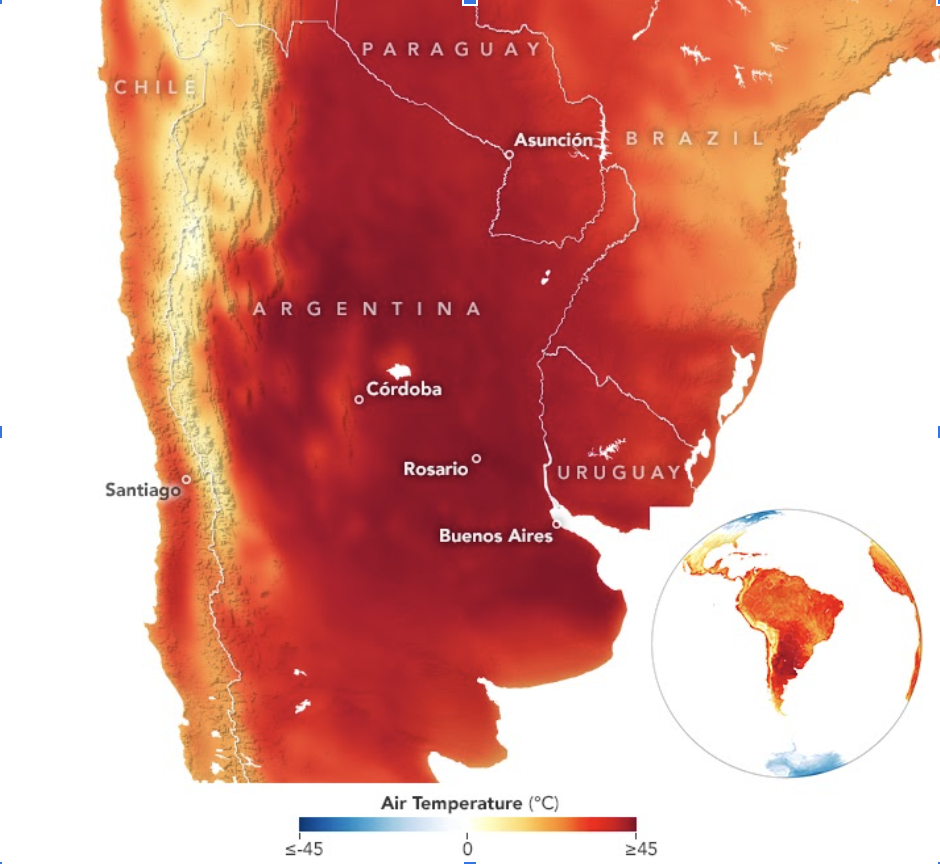El calentamiento global potencia y multiplica la recurrencia de eventos extremos, como las olas de calor, las sequías y las inundaciones. Según el trabajo “Influencia causal de forzantes antropogénicos en la ola de calor en Argentina de 2013” del Consejo Nacional de Investigaciones Científicas y Técnicas (CONICET), por el cambio climático hay cinco veces más probabilidades de que ocurran olas de calor en el país.